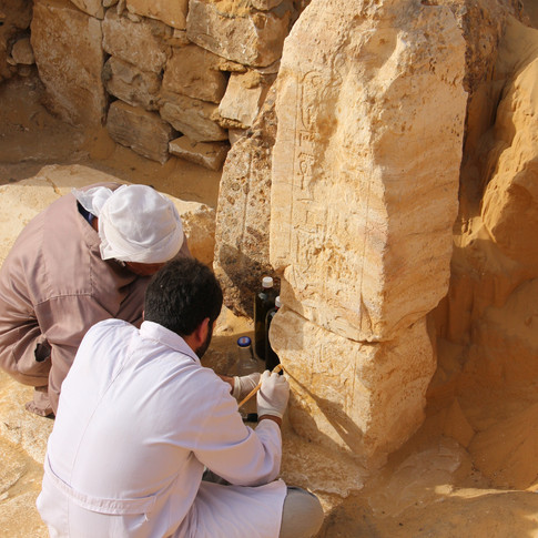Devant la porte d'entrée du complexe de Neit se trouvaient aussi deux obélisques laissés en place par G. Jéquier. Ils sont aujourd'hui en très mauvais état et nous les avons donc rapatriés dans les magasins de la Mission, pour les préserver et les restaurer. Notre travail sur le complexe de la reine Neit prend ainsi fin, et devrait prochainement aboutir à une publication décrivant les résultats de nos recherches en ces lieux.